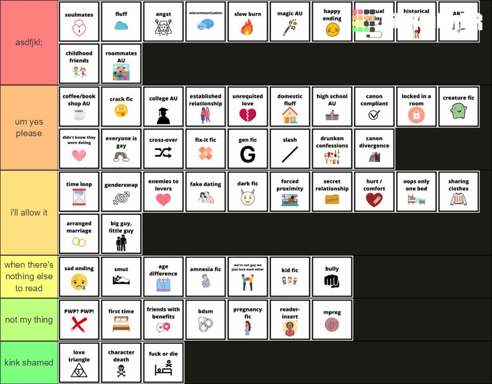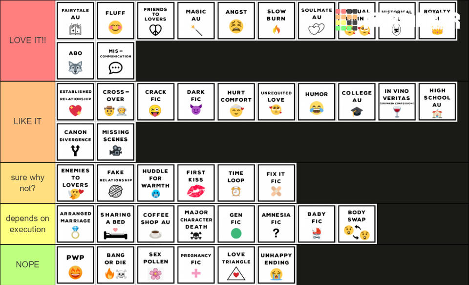there're two tier lists that i won't explain at all and yes i realise that some tropes are in both tier makers and i put them in different tiers, shhh i'm conflicted. sadly, the tiermaker logo covers some of the tropes: mutual pining, historical au, abo and royalty au.